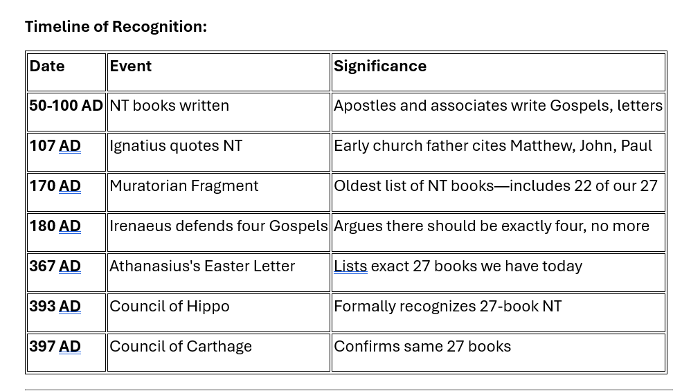 By 325 AD, the books we now call the New Testament had already been circulating for over two centuries. Churches across the Roman Empire were already using them. The earliest complete list we have of the 27 New Testament books comes from Athanasius in 367 AD, but he wasn’t inventing anything. He was documenting what churches had already recognized for generations. The canon wasn’t created by vote. It was recognized through consensus over time.